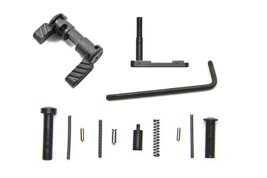 This Umbrella kit supplements the parts included with our billet lower but we purposely leave out the trigger–we expect most of you will want to go with a high-end trigger/hammer set so we’re leaving that up to you. Everything else you need is included to complete your billet lower receiver less the required stock assembly (receiver extension, end plate, extension nut, buffer, action spring, stock). In addition to the high quality individual pieces, this kit includes Battle Arms Development’s BAD-CASS ambidextrous 45° short throw selector and Umbrella’s own Grip 23. Parts kit includes the following components: